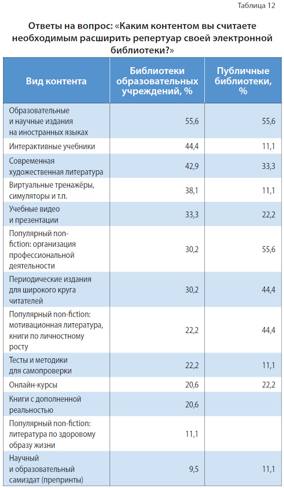При этом более половины респондентов как в образовательных учреждениях, так и в публичных библиотеках хотели бы пополнить электронные фонды образовательными и научными изданиями на иностранных языках. В вузах и колледжах востребованны интерактивные учебники, современная художественная литература, виртуальные тренажёры, симуляторы и т.п. В общественных библиотеках — популярный non-fiction по организации профессиональной деятельности и мотивационная литература, периодические издания для широкого круга читателей (табл. 12).