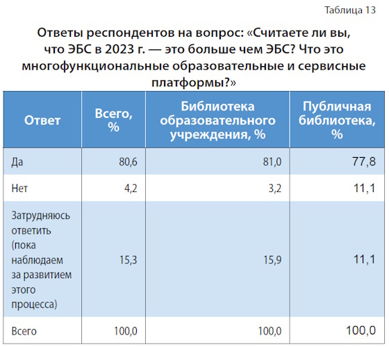 В ходе исследования респондентам было предложено ответить на вопрос: «Считаете ли вы, что ЭБС в 2023 г. — это больше чем ЭБС? Что это многофункциональные образовательные и сервисные платформы?». Ответы на него представлены в табл. 13. Анализ показывает, что подавляющее большинство опрошенных (более 80%) согласны с данным утверждением, 4,2% — не согласны, а ещё 15,3% пока наблюдают за развитием процесса.