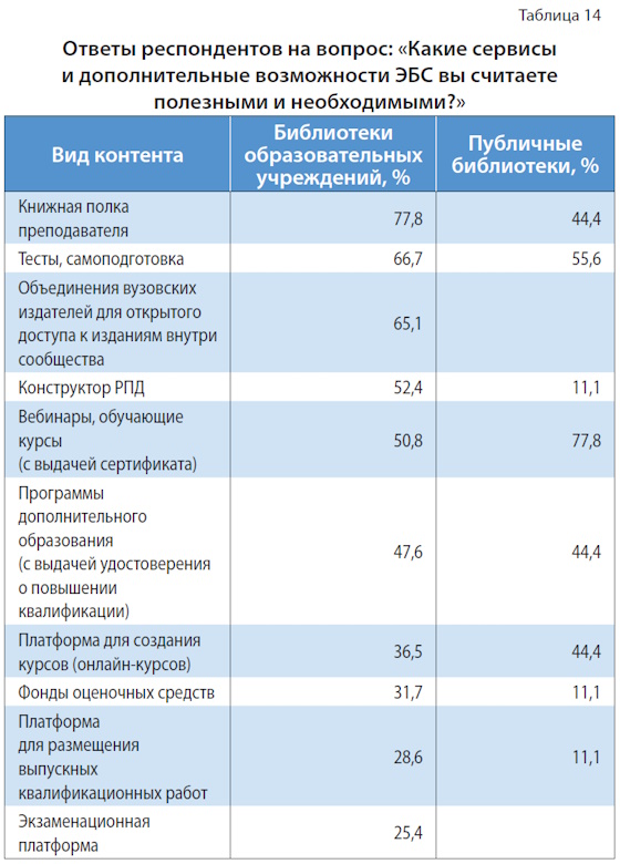 Представляют интерес ответы участников исследования на вопрос: «Какие сервисы и дополнительные возможности ЭБС вы считаете полезными и необходимыми?». Анализ показывает, что для респондентов из образовательных учреждений наиболее востребованными опциями являются книжная полка преподавателя, наличие тестов и сервисов самоподготовки. 65% отметили важность объединения вузовских издателей для обеспечения открытого доступа к изданиям внутри объединения (наиболее яркий и популярный пример — Консорциум сетевых электронных библиотек от ЭБС Лань). Более половины опрошенных хотели бы видеть в ЭБС конструктор рабочих программ дисциплин (РПД).