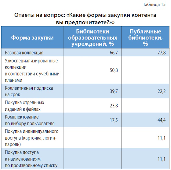 Как показывает анализ данных, представленных в табл. 15, наиболее распространённый формат закупки электронного контента — базовая коллекция; его предпочитают респонденты и из образовательных учреждений, и из публичных библиотек. Более половины учебных заведений закупают узкоспециализированные коллекции в соответствии с учебными планами, 39,7% осуществляют коллективную подписку на срок. 44,4% коллег из публичных библиотек предпочитают комплектование по выбору пользователя.