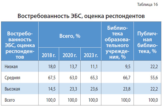 В ходе исследования респондентам было предложено оценить востребованность ЭБС и указать наиболее активные группы пользователей. Из анализа данных табл. 16 следует, что, по мнению опрошенных, эта востребованность неуклонно повышается: сокращается доля оценки «Низкая» и растёт — оценки «Высокая».