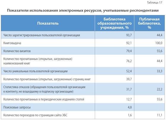Как показывает анализ данных, представленных в табл. 17, все публичные библиотеки и подавляющее большинство образовательных учреждений (92,1%) учитывают в статистике книговыдачу. На первом месте у образовательных учреждений — число зарегистрированных пользователей организации (93,7%). Часто применяются у этой категории респондентов такие показатели, как количество визитов (79,4%) и количество прочитанных (открытых, загруженных) наименований книг (76,2%).