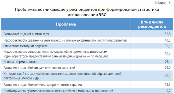 В ходе исследования респондентам было предложено ответить на вопрос о проблемах, возникающих при формировании статистики использования ЭБС. Позиции опрошенных характеризуют данные табл. 18. Как показывает анализ, более половины респондентов указали на различия в подсчёте книговыдач, 40% — на некорректность сравнения уникальных и суммарных данных по числу пользователей, 36,1% беспокоит отсутствие методики подсчёта.