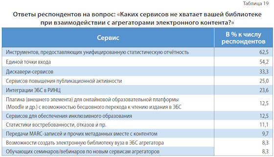Тесно связаны с темой статистики оценки респондентами сервисов, которых, по их мнению, недостаточно при взаимодействии с агрегаторами (табл. 19). Так, 62,5% опрошенных сообщили о том, что им не хватает инструментов, предоставляющих унифицированную статистическую отчётность (пять лет назад эта проблема не была столь приоритетной, и её доля составляла 37%). Кроме того, остаётся востребованной единая точка входа (54,2%), находившаяся в 2018 г. на вершине рейтинга требуемых сервисов. Почти в два раза повысилась доля дискавери-сервисов (16,3% в 2018 г.). Почти четверть респондентов считают необходимым наличие сервисов повышения публикационной активности и интеграции ЭБС в Российский индекс научного цитирования (РИНЦ).