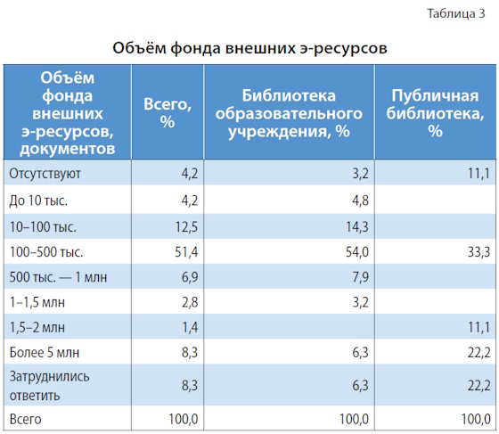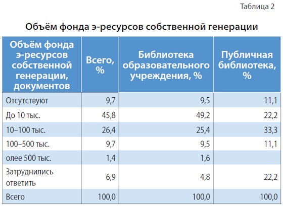 Данные табл. 2 характеризуют объём фонда собственных электронных ресурсов организаций, принявших участие в исследовании (ЭБС учреждения, репозиторий, электронная библиотека и т.п.). Как показывает анализ, в основном такие ресурсы насчитывают до 10 тыс. документов, и это характерно прежде всего для библиотек образовательных учреждений. Ещё 26,4% респондентов располагают от 10 до 100 тыс. документов собственной генерации. 6,9% опрошенных затруднились ответить на этот вопрос, а 9,7% указали, что у них нет своих ресурсов.