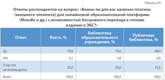 Ответы респондентов на вопрос: «Важно ли для вас наличие плагина (внешнего элемента) для онлайновой образовательной платформы (Moodle и др.) с возможностью бесшовного перехода к чтению издания в ЭБС?» — характеризуют данные табл. 20.