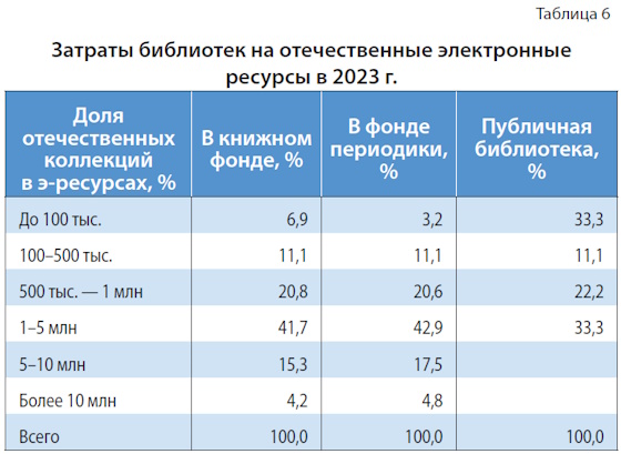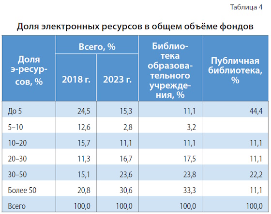Анализ показывает, что растёт и доля электронных ресурсов (табл. 4). Если сравнить показатели 2023 г. с данными 2018-го, то библиотек, в фондах которых э-ресурсы занимают свыше 30%, стало почти на 18% больше (54,2% vs 36,9%). Напротив, снизилось число библиотек, где э-ресурсы составляют до 20% фонда: с 52,8% в 2018 г. до 29,2% в 2023-м.