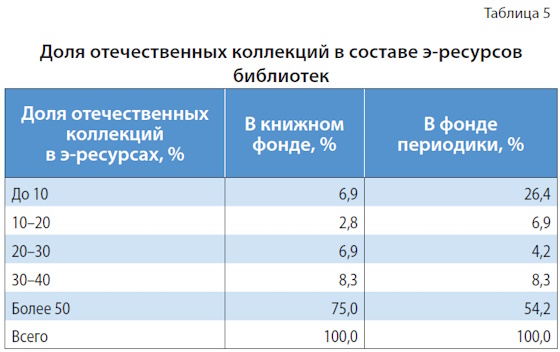 Долю отечественных коллекций в составе электронных ресурсов характеризуют данные табл. 5, из которой следует, что в книжном фонде отечественные ресурсы преобладают (более 50% в фондах 75% участвующих в исследовании библиотек). Безусловно, на ситуацию не могли не повлиять события последнего года, связанные с отказом зарубежных агрегаторов от сотрудничества с российскими потребителями, хотя и в 2018 г. доля отечественных ресурсов составляла более 50% в фондах 72% участников исследования, с той оговоркой, что тогда не анализировалось разделение на книги и периодику.