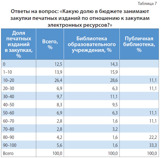 Ответы на вопрос: «Какую долю в бюджете занимают закупки печатных изданий по отношению к закупке электронных ресурсов?» — характеризуют данные табл. 7. Обращает внимание тот факт, что 12,5% респондентов (при этом 14,3% представителей библиотек образовательных учреждений) сообщили о том, что печатные ресурсы вообще не закупаются. Такое в истории мониторинга ЭБС произошло впервые. Примерно на том же уровне, что и пять лет назад, осталась доля библиотек, в закупках которых печатные книги по отношению к электронным ресурсам составляют до 30%: 50,8% в 2023 г. vs 51,1% в 2018-м. Среди организаций, закупающих много печатных книг (от 80% по отношению к электронным), особенно сильно проявилось различие между образовательными учреждениями (3,2%) и публичными библиотеками (55,5%).