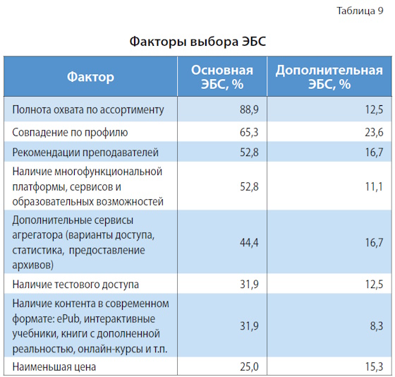 Факторы выбора основных и дополнительных ЭБС характеризуют данные табл. 9. Анализ показывает, что для подавляющего большинства респондентов (88,9%) главным критерием выбора основной ЭБС является полнота охвата по ассортименту. Пять лет назад этот фактор назвали 73,2% опрошенных. Тогда же на втором месте стояла приемлемая цена (63,7%). Сегодня этот фактор стал наименее значимым при выборе основной ЭБС и занимает долю в 25%. Совпадение по профилю — второй по значимости критерий, примерно такую же долю он занимал в 2018 г. Возросла доля рекомендаций преподавателей: с 39,1% в 2018 г. до 52,8% в 2023-м. Столь же значимо (52,8%) наличие многофункциональной платформы, сервисов и образовательных возможностей. Доля дополнительных сервисов агрегаторов практически не изменилась.