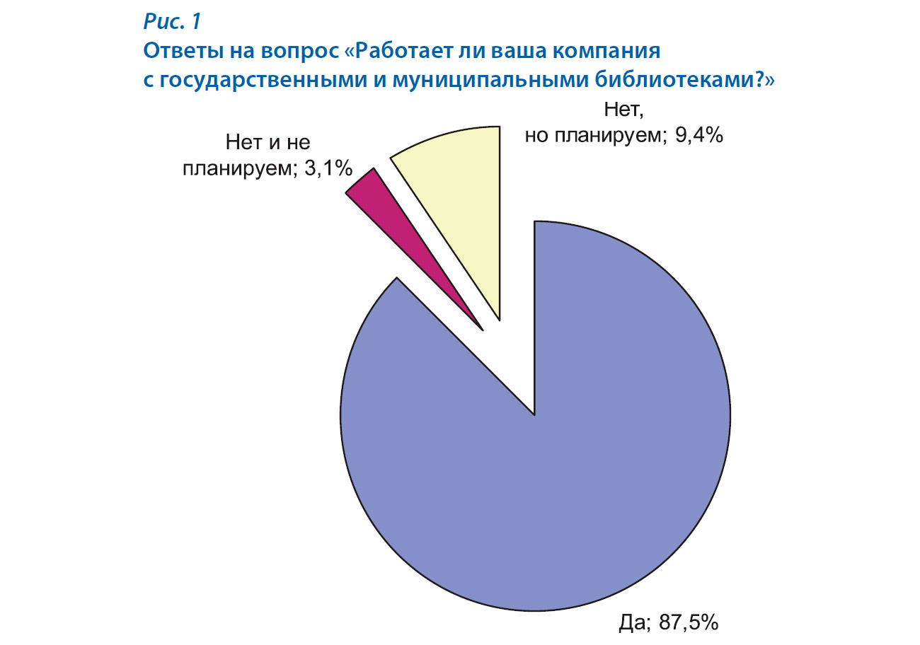 Как показал анализ, в исследовании вновь приняли участие компании, заинтересованные в сотрудничестве с библиотеками. В 2023 г. их оказалось 96,9%, что примерно соответствует показателю 2022-го.