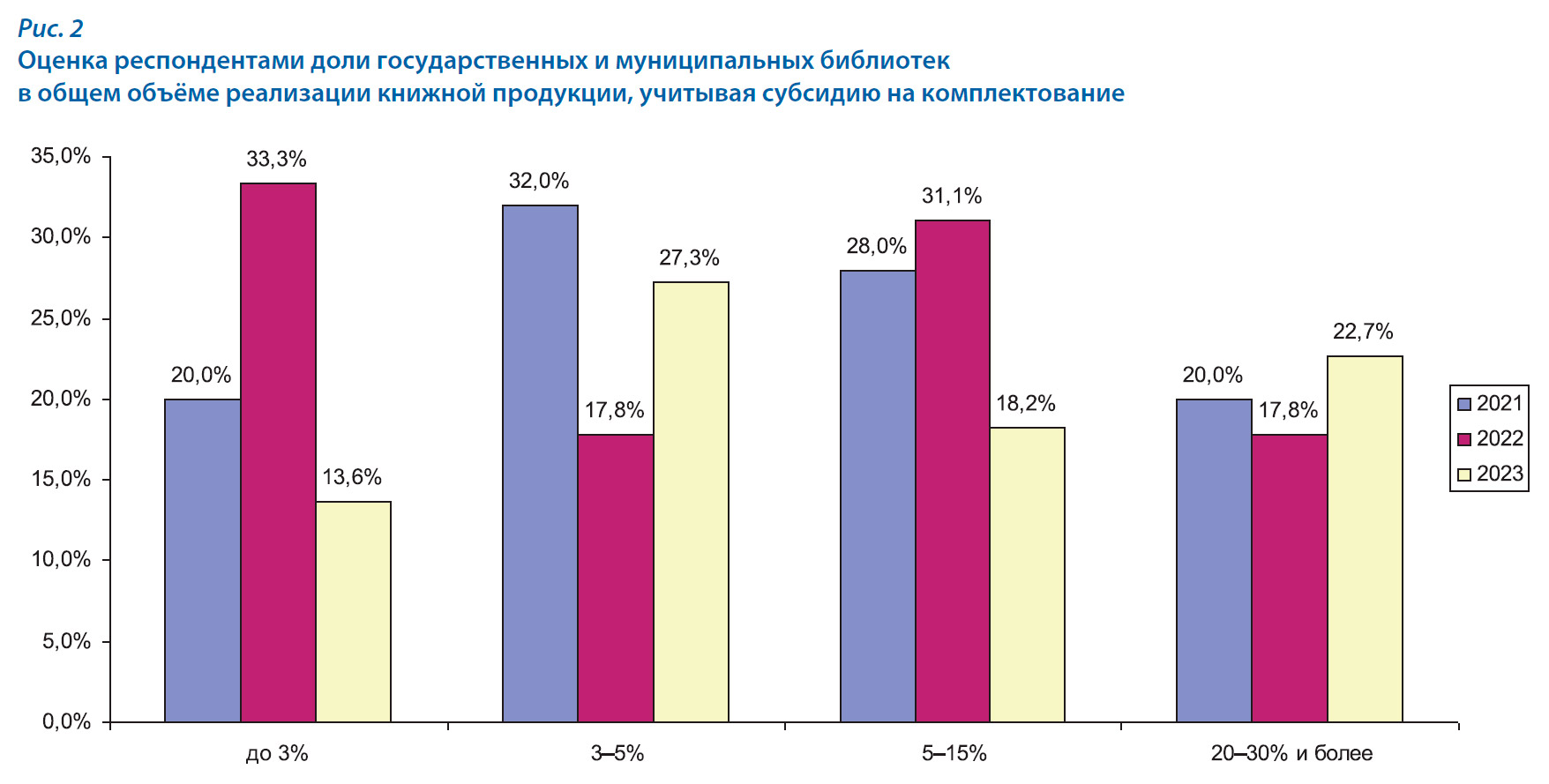 Как показал анализ, в 2023 г. несколько увеличилось число поставщиков, у которых доля библиотек в общем объёме реализации составляет 20–30% и более, и сократился процент тех, у кого доля библиотечных закупок менее 3%. В основном и в 2022 г., и в 2023-м порядка половины респондентов заявили о том, что эта доля составляет от 3 до 15%. При этом в 2023 г. 18,2% отметили, что библиотеки не приобретали у них книги. «У нас никто по субсидии не закупал. Библиотеки ссылаются обычно на недостаточные бюджеты», — подчеркнули в издательстве «Баобаб».