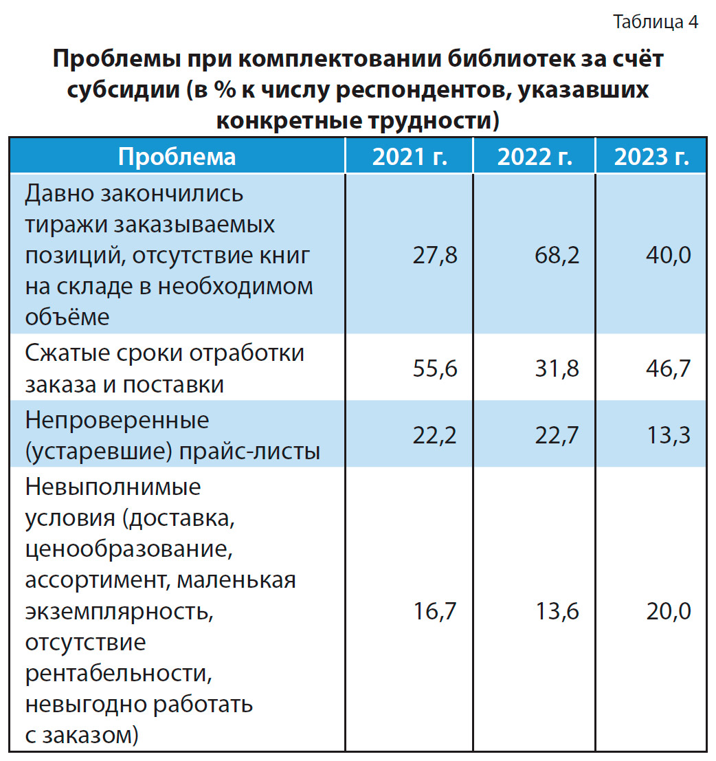 В 2023 г. 42,3% респондентов сообщили о том, что не испытали никаких трудностей при комплектовании библиотек за счёт субсидии (в 2022-м — 52,5%, в 2021-м — 33%). Актуальными проблемами остаются отсутствие книг на складе в необходимом объёме и сжатые сроки отработки заказа и поставки (табл. 4). Коллеги из фонда «Центр духовного возрождения Чернозёмного края» отметили, что в большинстве случаев отказ мотивировали малым репертуаром издаваемых книг. Несколько снизилась острота темы актуальности прайс-листов, но издатели продолжают ставить вопрос о выполнимости условий по доставке, ценообразованию, рентабельности, экземплярности и т.д.