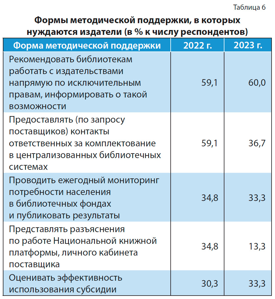Желаемые формы методической поддержки по вопросам использования субсидии представлены в табл. 6. Как показывает анализ, остаётся актуальным предложение рекомендовать библиотекам работать с издательствами напрямую по исключительным правам, информировать о такой возможности. «Иногда их нужно просто заставлять работать», — прокомментировали в издательстве «О Краткое». «Это надо сделать, чтобы исключить монополию, так как множество регионов средства субсидии тратят на продукцию только двух крупнейших издательств», — пояснили в ИГ «Альпина Паблишер».