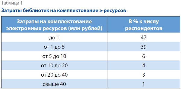 В первую очередь, большой интерес вызывают бюджеты библиотек, выделяемые на комплектование электронными ресурсами (табл. 1). 86% опрошенных тратят на них до 5 млн рублей ежегодно.