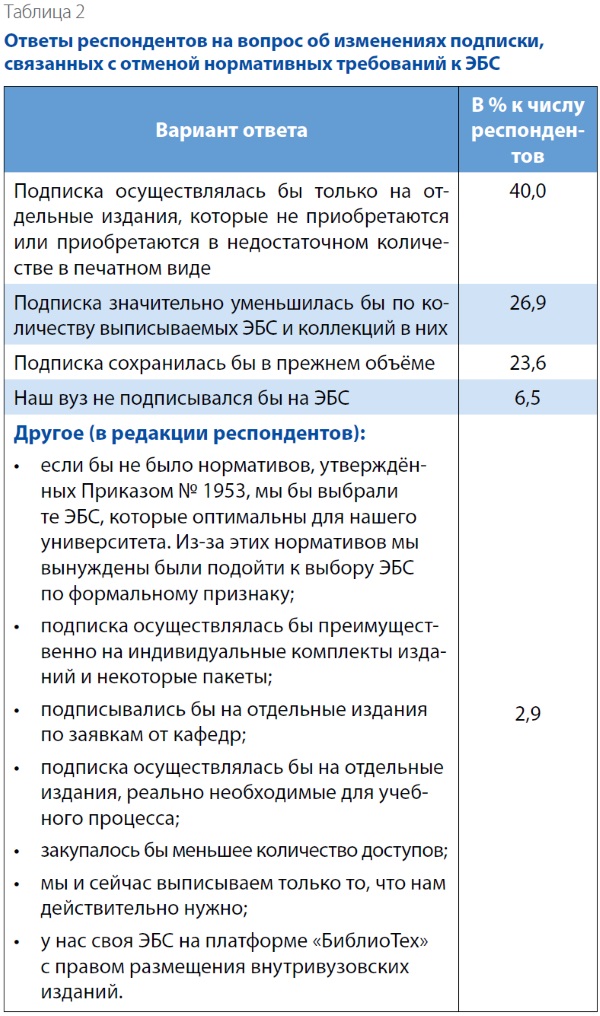 Не меньший интерес представляют результаты ответов респондентов на вопрос «Что изменилось бы, если подписка на ЭБС осуществлялась без необходимости соблюдения требований Лицензионных нормативов (Приказа Рособрнадзора от 5 сентября 2011 г. № 1953)?». Следует пояснить, что в период проведения опроса указанные нормативы ещё действовали, поэтому можно сказать, что ответы респондентов характеризуют объективные тренды, повлиявшие на отмену приказа (табл. 2).