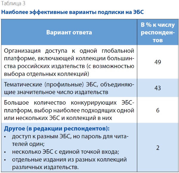 Что касается наиболее эффективных вариантов подписки на ЭБС, мнения респондентов разделились (табл. 3).