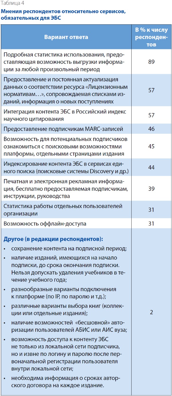 Отвечая на вопрос «Какие сервисы должны быть обязательными в каждой ЭБС?», участники исследования могли выбрать любое количество вариантов ответов (табл. 4).