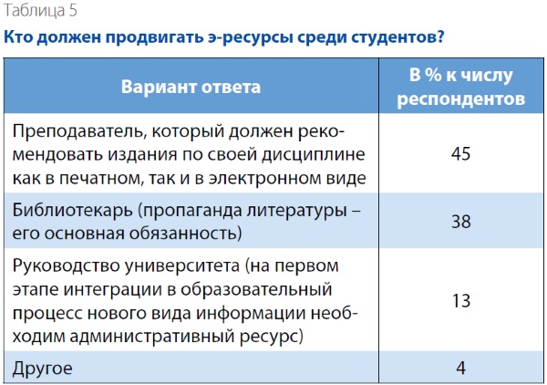Тема продвижения электронных вариантов учебников и учебных пособий, их рекомендования студентам является приоритетной. Респонденты в своих ответах чётко дали понять, что за прошедшие три года проведения семинаров и тренингов для преподавателей и студентов, распространения наглядных пособий, представления отчётов по использованию ресурсов роль библиотекаря во многом исчерпана: если преподаватель не рекомендует студентам издания, включённые в ЭБС, то дальнейшие действия специалистов библиотек бесполезны. Закономерность этого вывода подтверждает анализ данных табл. 5.