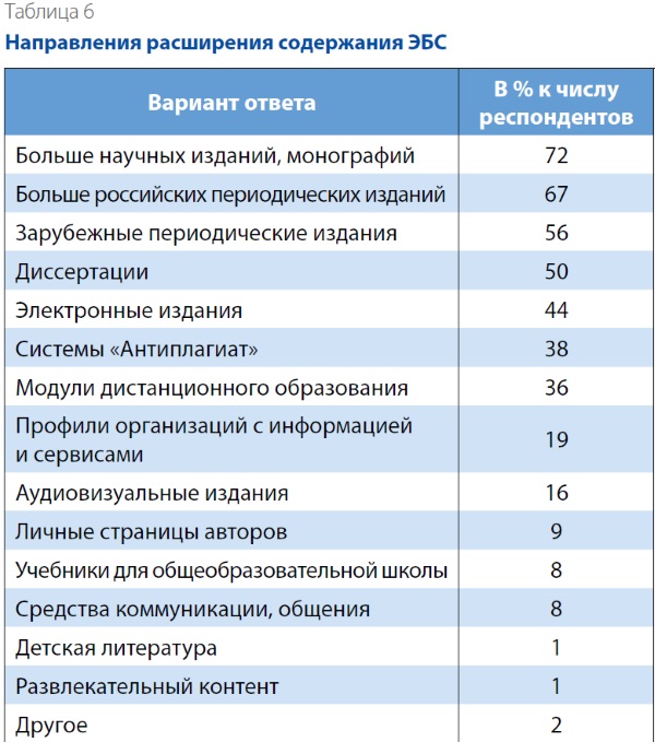 Что касается контентного наполнения ЭБС, то большинство респондентов предложили расширить их состав научными изданиями, монографиями, российской и зарубежной периодикой, диссертациями (табл. 6).