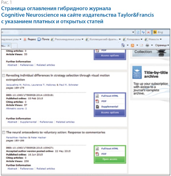 Открытые статьи в платных журналах. Журналы, включающие открытые статьи, получили название гибридных (hybrid journals). Они размещаются в общем каталоге издательства, но в оглавлении конкретного выпуска журнала указано, какие именно статьи находятся в открытом доступе по решению авторов. Примером может служить доступ Open Select к гибридным журналам издательства Taylor & Francis (www.tandfonline.com). На рис. 1 показан экран просмотра оглавления журнала Cognitive Neuroscience, где разным цветом отмечены платные и открытые статьи.