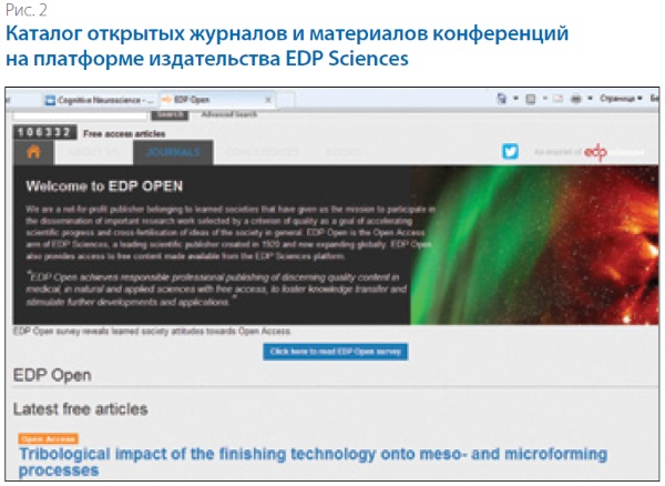 Открытые журналы на одной платформе с платными. Открытые журналы могут размещаться издательствами в общем каталоге (со специальным обозначением открытых журналов) либо в каталоге только открытых журналов. Например, отдельный каталог открытых журналов, книг и материалов научных конференций представлен на платформе издательства EDP Sciences в разделе открытых ресурсов (www.edp-open.org). На рис. 2 показана стартовая страница, с которой можно перейти к просмотру списков открытых изданий и их полных текстов.
