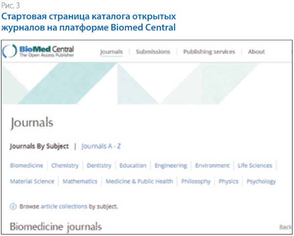 Открытые платформы журналов и книг. Если в открытом доступе есть все публикации издательства (или большинство), они могут быть размещены на отдельной электронной платформе. Пример — платформа открытых электронных журналов биомедицинского издательства Biomed Central www.biomedcentral.com. Рисунок 3 иллюстрирует стартовую страницу каталога, который далее можно просматривать по алфавиту либо по тематикам. Поскольку все журналы Biomed Central являются открытыми, специальные обозначения открытых статей не используются.