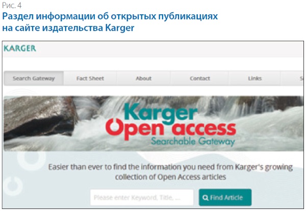 · Информация на издательских сайтах (бесплатная). Помимо приведённых выше примеров следует отметить сайт издательства Karger www.karger.com, на котором открытым публикациям отводится раздел Karger Open Access. На рис. 4 представлена стартовая страница раздела, в котором помимо каталога открытых журналов содержатся правила публикации статей в открытых и гибридных журналах (For Authors, Submit), а также полезные для библиотек ссылки на документы международных организаций и публикации по вопросам открытого доступа (For Universities, Institutions & Librarians). Разделы или страницы, посвящённые открытому доступу, имеют сайты большинства научных издательств. При этом каждое издательство обеспечивает поиск только по каталогу своих журналов.
