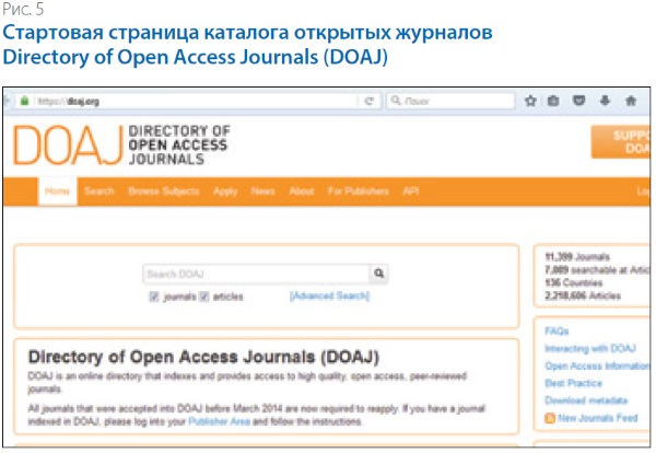 · Указатели и сводные каталоги открытых журналов разных издательств (бесплатные). Наиболее известен электронный каталог Directory of Open Access Journals (DOAJ) www.doaj.org — некоммерческий проект компании Infrastructure Services for Open Access (IS4OA), Великобритания. Участниками и спонсорами проекта являются научные и профессиональные издательства, чьи открытые журналы включены в DOAJ, а также международные организации, поддерживающие открытый доступ, — например, Ассоциация научных издательств открытого доступа (OASPA) www.oaspa.org. На рис. 5 показана стартовая страница сайта DOAJ, с которой можно перейти в каталог журналов или в многочисленные разделы дополнительной информации. В каталоге 11 408 журналов, из них 7 092 доступны для поиска на уровне статей. Разница между этими двумя показателями объясняется составом метаданных, которые поступают в DOAJ от различных издательств. Администрация каталога не занимается подготовкой или редактированием метаданных, в её задачи входит размещение информации издательств.