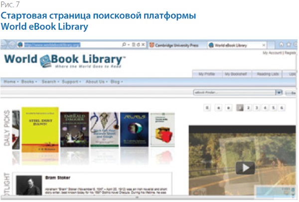 World eBook Library (WEL, www.worldebooklibrary.org, рис. 7) позиционируется как открытая платформа первичных источников, включающая 23 млн книг, журналов и документов на 57 языках. WEL предлагается библиотекам начиная с 2011 г. и первоначально предназначалась для доступа к 3 млн электронных книг. Позже на основании анализа потребностей библиотек платформа была дополнена журналами, аудиокнигами, официальными документами и энциклопедическими статьями. Как и GeJL, она предоставляет статистику результатов поиска, поэтому может рассматриваться как полноценный библиотечный ресурс. Многие книги были переведены в электронную форму специально для размещения на WEL, в том числе издания из фондов Британской библиотеки, Библиотеки Конгресса США. Значительную часть книжной коллекции составляют издания университетов: Harvard University, Stanford University, Massachusetts Institute of Technology, Princeton University, Oxford University, Michigan University, Toronto University. Предусмотрены администраторские сервисы для библиотекаря (сбор статистики использования, создание поисковых профилей для сигнальной информации, виртуальная книжная полка).