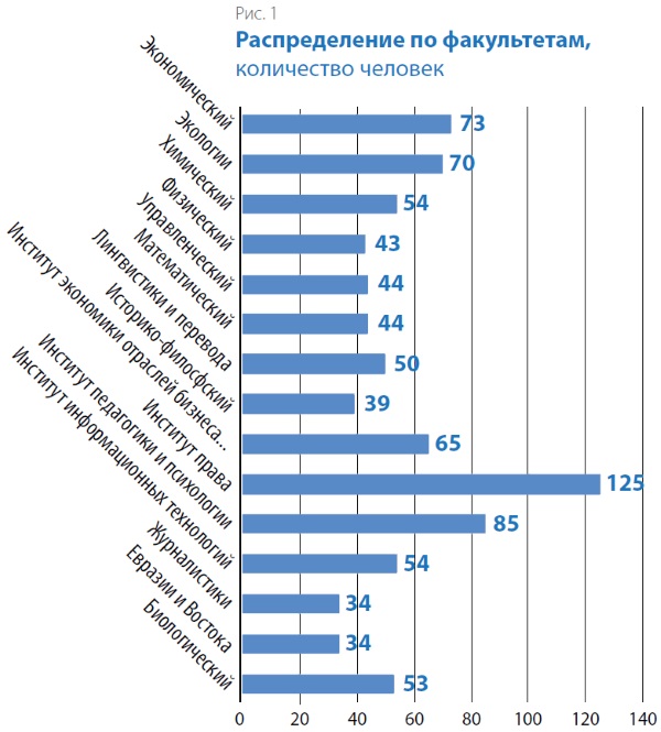 Проведя такую значительную, на наш взгляд, работу, мы решили выяснить мнение студентов об ЭБС, а заодно узнать, удалось ли нам привлечь преподавателей к использованию электронных изданий по своим дисциплинам. В апреле — мае 2016 г. в читальных залах и на абонементе библиотеки было проведено специальное исследование, в котором приняли участие 854 студента очной формы обучения всех факультетов (10% их общего числа, или не менее 30 студентов каждого факультета). Распределение респондентов по факультетам иллюстрирует рис. 1.