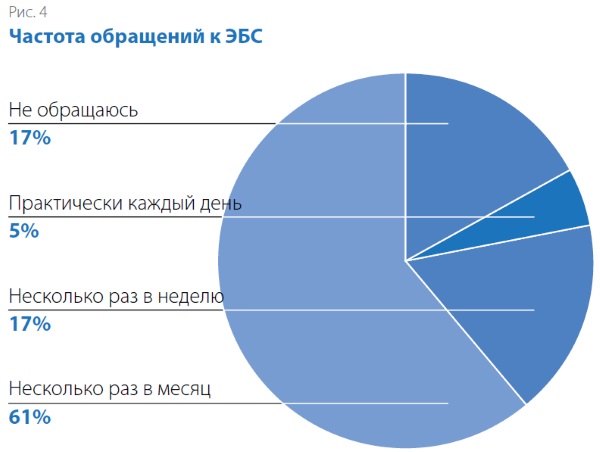 Результаты исследования свидетельствуют о том, что 82% респондентов имеют личный опыт использования ЭБС. При этом 516 человек обращаются к ЭБС несколько раз в месяц, 146 — несколько раз в неделю, 43 — практически каждый день (рис. 4).
