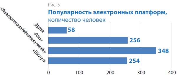 Помимо ЭБС «Лань» и «Университетская библиотека онлайн» респонденты довольно часто обращаются к Научной электронной библиотеке eLibrary.ru (рис. 5), поскольку Челябинский государственный университет уже несколько лет подписан на коллекцию из 156 российских журналов в полнотекстовом электронном виде (по итогам 2015 г. — больше 10 тыс. просмотров).