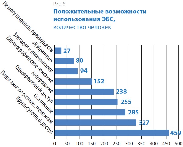 На первое место респонденты поставили возможность круглосуточного доступа к электронным изданиям. Немаловажными являются возможности поиска интересующей книги по разным её элементам, а также их скачивания и копирования (рис. 6).