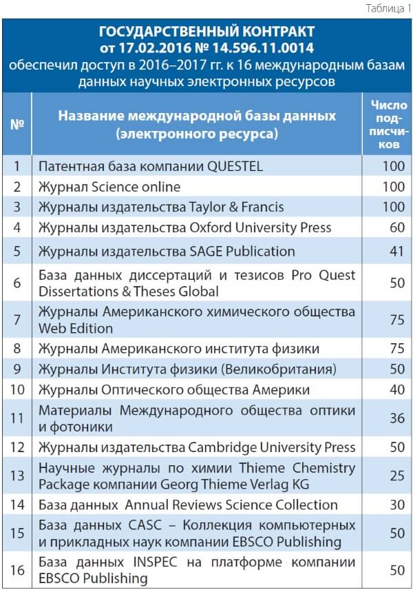 Обсуждение началось с оценки результатов работы за предыдущий год. Заместитель генерального директора ГПНТБ России Галина Евстигнеева напомнила, что в 2016 г. ГПНТБ России как оператор Национальной подписки предоставила доступ к 22 полнотекстовым ресурсам (табл. 1 и 2) и двум библиометрическим базам данных: Web of Science и Scopus. Один из контрактов обеспечивал доступ к 16 полнотекстовым ресурсам, другой — к шести. К Scopus получили доступ 120 организаций, а к WoS — 170.