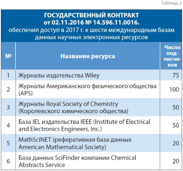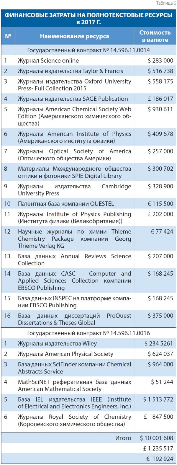 В рамках Национальной подписки предоставляется доступ к 22 полнотекстовым журналам и базам данных. Финансовые затраты характеризуют данные табл. 6.