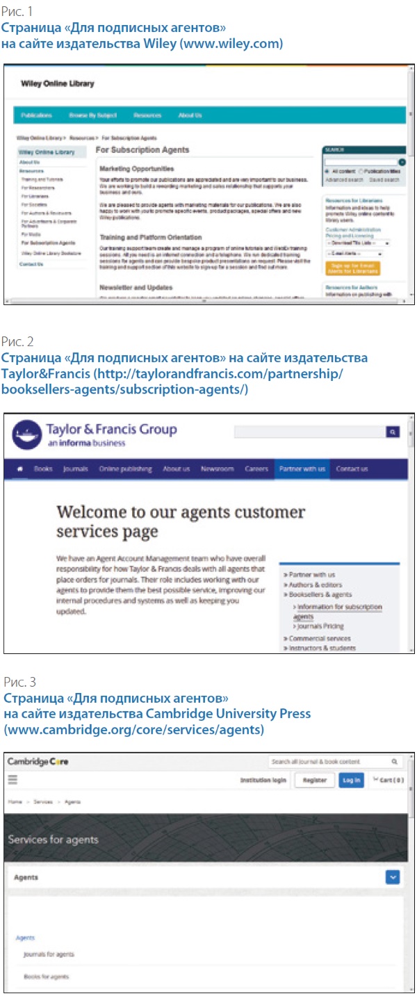 Рассмотрев положения конкурсной документации, важные для взаимодействия заказчика и исполнителя, нельзя не упомянуть ещё один вопрос. А кто они, эти исполнители, которые решаются участвовать в торгах по подписке на зарубежную периодику, несмотря на очевидную сложность этой работы, риски, противоречия в международных законодательствах? Если бы речь шла о закупке книг, то логично было бы ожидать в качестве участников книготорговые организации. А кого может ожидать библиотека на конкурс по подписке на периодику? На самом деле для организации, специализирующейся на подписке, имеется название — агент по подписке (или подписное агентство), в международной деловой практике — subscription agency. Казалось бы, какая разница, как называется исполнитель? Лишь бы он мог исполнить условия контракта и обеспечить подписку. Но это вопрос принципиальный. Профессия подписного агента предполагает специальные знания, навыки, деловые связи и даже свой профессиональный язык. Агент в любой (не только библиотечной) сфере — это посредник, который действует от имени своего клиента. Другими словами, он выполняет работу, которую клиент мог бы сделать сам, но предпочёл поручить своему агенту. Всем известный пример — туристический агент, который организует для своего клиента путешествие (подбирает гостиницу, заказывает билеты, составляет маршрут). Или литературный агент, который представляет интересы писателя в издательствах. Так же и агент по подписке, размещая заказы библиотеки в издательствах, выступает как её представитель. Именно в этом качестве его воспринимают международные издательства, чью периодику российские библиотеки выписывают на конкурсной основе согласно ФЗ-44 и ФЗ-223. Издательства заинтересованы в сотрудничестве с агентами, создают для них специальные страницы и разделы на своих сайтах, где агенты могут получить актуальную информацию о ценах на подписку и её условиях, а также пройти специальное обучение. Примеры таких страниц приводятся на рис. 1, 2 и 3. Тем не менее термин «агент по подписке», широко применяемый в международной издательской и библиотечной деятельности, в российской практике организации зарубежной подписки не используется, а исполнитель соответствующих контрактов часто обозначается как продавец или поставщик. Хотя по своей сути продажа (или поставка) товара и оказание агентских услуг — это разные виды деятельности. Упомянутые выше положения конкурсной документации, вызывающие трудности при исполнении контрактов на зарубежную подписку, во многом обусловлены именно смешением понятий продажи и агентских услуг. Это мешает библиотекам понять, чего можно и даже необходимо требовать от подписного агента, а что нереально и создаёт опасность, что контракт не будет исполнен.