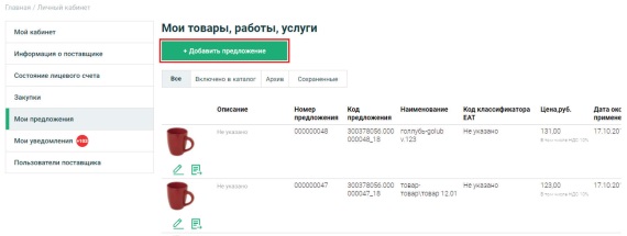 Поставщикам для участия на ЕАТ рекомендуется приобрести электронно-цифровую подпись (ЭЦП). Её можно оформить для всех электронных цифровых площадок. С целью работы на ЕАТ предварительно требуется зарегистрироваться в Единой системе идентификации и аутентификации на портале госуслуг (ЕСИА). Далее следует пройти аккредитацию и внести информацию о предлагаемых товарах в личном кабинете на ЕАТ. Для включения в каталог товаров, работ и услуг (ТРУ) ЕАТ информации о предлагаемом товаре (работе, услуге) в личном кабинете поставщика необходимо перейти в раздел «Мои предложения», нажать на кнопку «Добавить предложение» и по каждой позиции внести необходимую информацию (рис. 2).