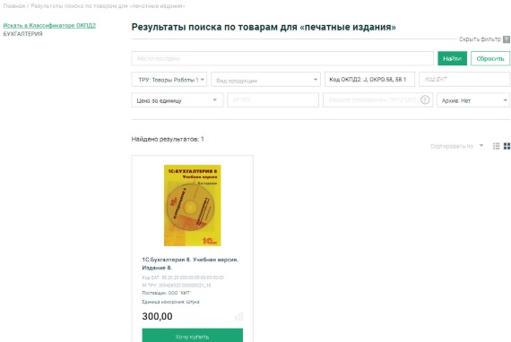 Пока на ЕАТ «Берёзка» нам удалось найти всего одну позицию по запросу «Печатные издания» (рис. 4). Однако мы знаем, как активно в этом направлении работают региональные площадки (например, Портал поставщиков Москвы). Пока трудно себе представить, как текущее предложение книжного рынка для комплектования библиотек может быть представлено на ЕАТ «Берёзка», если предлагается использовать ОКДП2, где есть, например, категория «книги». Критерий выбора победителя — наименьшая цена — тоже нас вряд ли устроит. Видимо, следует ставить вопрос об исключении для закупок в целях комплектованию библиотек.