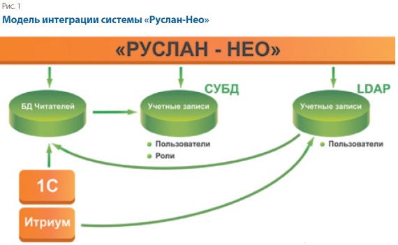 Важный участок работы — составление технического задания с учётом множества деталей и их документированием. Практически ежедневно велись переговоры, совместные скайп-конференции с сотрудниками УИТ и разработчиками. Следовало грамотно, без ошибок свести воедино информационные системы (АБИС «Руслан-Нео», базу данных пользователей LDAP, включающую в себя сведения пропускной системы НГУ «Итриум», и программу 1С; рис. 1).