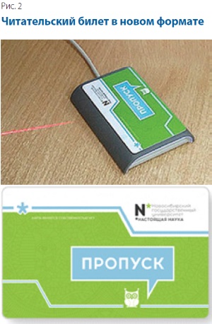 С появлением возможности аутентификации, настройки синхронизации баз данных НГУ и библиотеки мы смогли отказаться от изготовления читательских билетов. В настоящее время читательским билетом является пропускная карта НГУ. В целях идентификации читателя было закуплено 11 считывателей и столько же лицензий на установку ПО к ним. Именно это оборудование позволило использовать пропускную карту и оптимизировать процесс идентификации читателей (рис. 2).