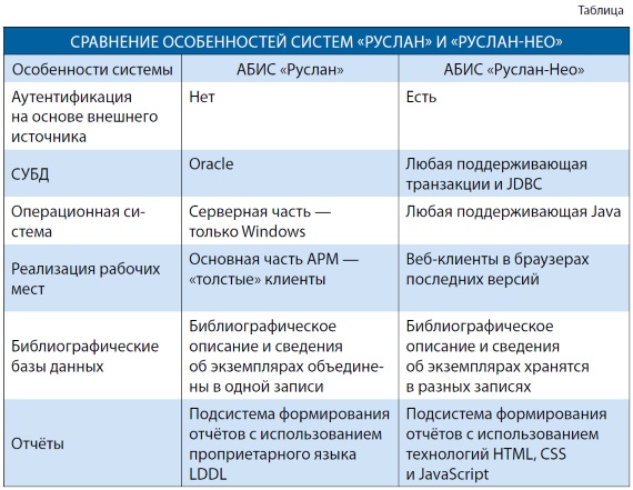 В новой системе заложена возможность аутентификации на основе внешнего источника (единая система идентификации НГУ). Это было использовано при её внедрении в университете. АБИС является кроссплатформенной, что снимает ограничения по типу операционной системы, устанавливаемой на серверах. Новый «Руслан» может использовать реляционную систему управления базами данных со свободной лицензией — это позволило нам перейти на СУБД PostgreSQL, зарегистрированную как российское ПО, что сейчас становится важным. «Руслан-Нео» даёт возможность формировать выходные формы и отчёты в современных офисных программах, включая текстовые редакторы с открытой лицензией (табл.).