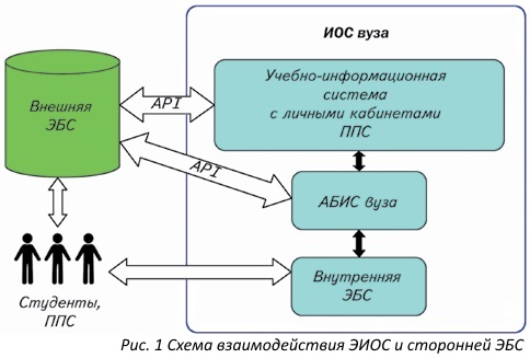 Но ЭБС в классическом виде, в котором они существовали в 2011–2018 гг., сейчас меньше интересуют пользователей. Всё чаще происходит их трансформация в образовательные платформы и профессиональные базы данных. И не только потому, что этого требуют новые ФГОС. Важнейшей отличительной чертой профессиональной базы данных, по нашему мнению, является агрегация и накопление соответствующего отраслевого контента. Развитие в ЭБС различных сервисов, безусловно, необходимо, способствует повышению её привлекательности для заказчика и востребованности пользователями, но не служит ключевым фактором при принятии решения об организации платного доступа к ней. Более того, некоторые сервисы представляются избыточными, так как не лучшим образом дублируют функционал, существующий в электронно-информационной образовательной среде вуза (ЭИОС). Характерный пример — модуль «Книгообеспеченность». Подобные сервисы достаточно квалифицированно и полно проработаны во всех известных и широко применяемых в вузах автоматизированных библиотечно-информационных системах (АБИС), которые, в свою очередь, глубоко интегрированы в ЭИОС вуза, учитывают обеспеченность дисциплин не только литературой в электронном виде, но и в печатном. Поскольку довольно часто вузы выписывают не одну ЭБС, серьёзной проблемой является учёт литературы, представленной в различных ресурсах. Предпочтительным представляется использование в ЭИОС современного университета основного функционала сторонней ЭБС (поиск книги или периодического издания, цитаты, закладки, групповая работа и т.д.) через API. Такое решение упрощает работу преподавателей, а также менеджмента библиотеки и вуза, нет необходимости подстраиваться под особенности интерфейса ЭБС (рис. 1).
