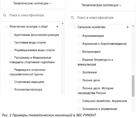 Аналогичную структуру имеют базы по другим отраслям: сельскому хозяйству и смежным наукам, педагогике, химии, строительству и т.д. Каждая имеет свою изюминку в виде эксклюзивных изданий. Например, как коллекции по сельскому хозяйству представлены учебная литература издательства «Колос-с», издания «Росинформагротеха» и Федерального научного центра животноводства имени академика Л.К. Эрнста. Все тематические коллекции представлены учебниками и учебными пособиями известных издательств и дополнены вузовскими изданиями. Это не только научная и методическая литература, но и порой учебные пособия по новым или редким дисциплинам, по которым коммерческие издательства не успевают выпускать учебники или считают это невыгодным. В качестве примера можно привести учебное пособие по велосипедному спорту: при подготовке к аккредитации один из спортивных вузов нашёл такое только в коллекции РГУФКСМиТ.