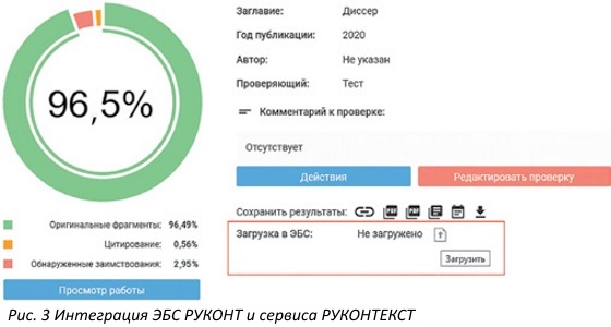 Наличие сервисов, как уже было сказано, не является определяющим преимуществом ЭБС, но всё же без них, без удобного и дружественного интерфейса, обойтись сложно. Поэтому в РУКОНТ за последние два года уделялось значительное внимание технологическому развитию. Изменён и сделан гораздо более понятным интуитивно интерфейс, заменена «читалка»: теперь она позволяет озвучивать текст и увеличивать шрифт, работать в группах, не говоря уже о цитатах и закладках. Несомненным достоинством является тесная интеграция с системой РУКОНТЕКСТ, которая на сегодня в России является одним из двух промышленных сервисов проверки на заимствования (рис. 3). Выгрузка выпускных квалификационных работ в ЭБС осуществляется одним нажатием кнопки, после чего они автоматически попадают в соответствующую собственную коллекцию вуза в РУКОНТ.