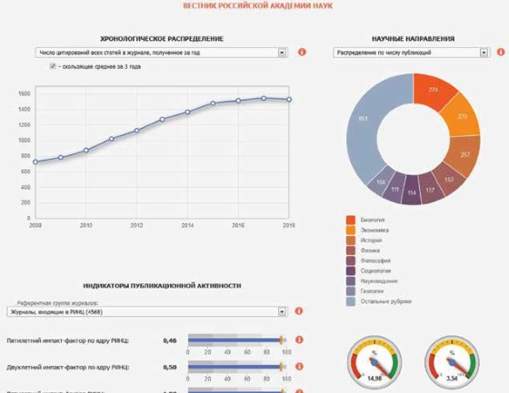 Визуализации подлежат хронологическое распределение по всем показателям за 15 лет, индикаторы публикационной активности, динамика развития журнала по научным направлениям и другие показатели.