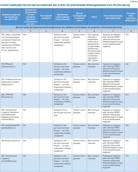 Неограниченный доступ для всех физических лиц и организаций. Подчеркнём, что данный критерий является необходимым условием ОД и однозначно требует помимо отсутствия ограничений в зависимости от юридического статуса пользователя, региона использования и т.п. ещё и отсутствия необходимости проходить регистрацию на сайте. В связи с этим любые платформы и ресурсы, которые разрешают доступ к полным текстам произведений только представителям организаций-подписчиков и лишь после регистрации, ни в коей мере не могут быть определены как проекты ОД до устранения данного ограничения. Из таблицы следует, что невыполнение этого критерия — отличительная черта большинства российских ЭБС и НЭБ eLibrary.ru.