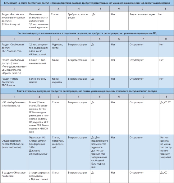 Отсутствие платы за использование контента. Ряд ЭБС и НЭБ (eLibrary.ru, Znanium.com, «Юрайт», Book.ru) имеют разделы, в которых собран бесплатный контент. На платформах Naukaru.ru, eLibrary.ru бесплатный контент смешан с платным, но присутствует «цветовая диверсификация/индикация», позволяющая визуально определить уровень доступа к полному тексту. Собственно бесплатным для пользователей фондом обладают только «КиберЛенинка» и MathNet. При этом очень небольшая часть статей на платформе MathNet остаётся недоступной для загрузки в полном тексте. К сожалению, ни один из рассмотренных ресурсов не позволяет выгрузить списки и метаданные всех ресурсов ОД в автоматическом режиме.