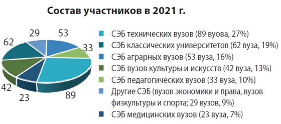 Всего к концу 2021 г. в Консорциуме СЭБ участвует 331 вуз. Если обратиться к составу участников проекта в нынешнем году, то очевидно, что наиболее значительными по количеству вузов остаются СЭБ технических вузов (89 организаций), СЭБ классических университетов (62), СЭБ аграрных вузов (53), СЭБ культуры и искусств (42), СЭБ педагогических вузов (33) (рисунок).