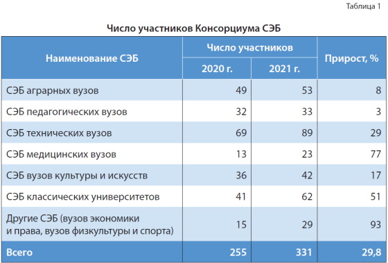 - Итак, к концу 2021 г. к участию в Консорциуме СЭБ присоединилась 331 организация. Это на 29,8% больше по сравнению с прошлым годом. Среди участников — отечественные и зарубежные (Казахстан и Белоруссия) вузы.